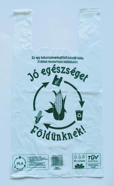 Környezetbarát, komposztálható, biológiai úton lebomló (PLA), megújuló forrásból származó, kukoricakeményítő alapú ingvállas táska. Megfelel az MSZ EN 13432:2000 szabványnak.