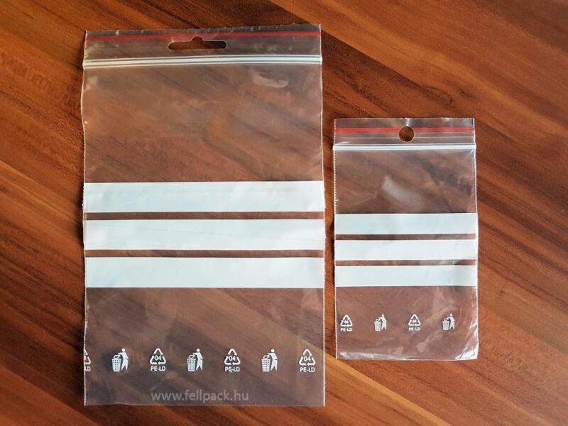 Önzáró simítózáras tasak akasztólyukkal, írható felülettel. Golyóstollal, alkoholos filctollal írható felülettel ellátva. Méret: 80 x 120 x 0,04 mm (szélesség x hosszúság x vastagság) A legkisebb választható mennyiség: 100 db,