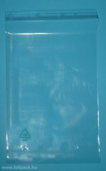 Ragasztócsíkos BOPP (celofánszerű) tasak. PP jelzés és 5 mm-es szellőzőlyuk található rajta. A legkisebb választható mennyiség: 100 db,